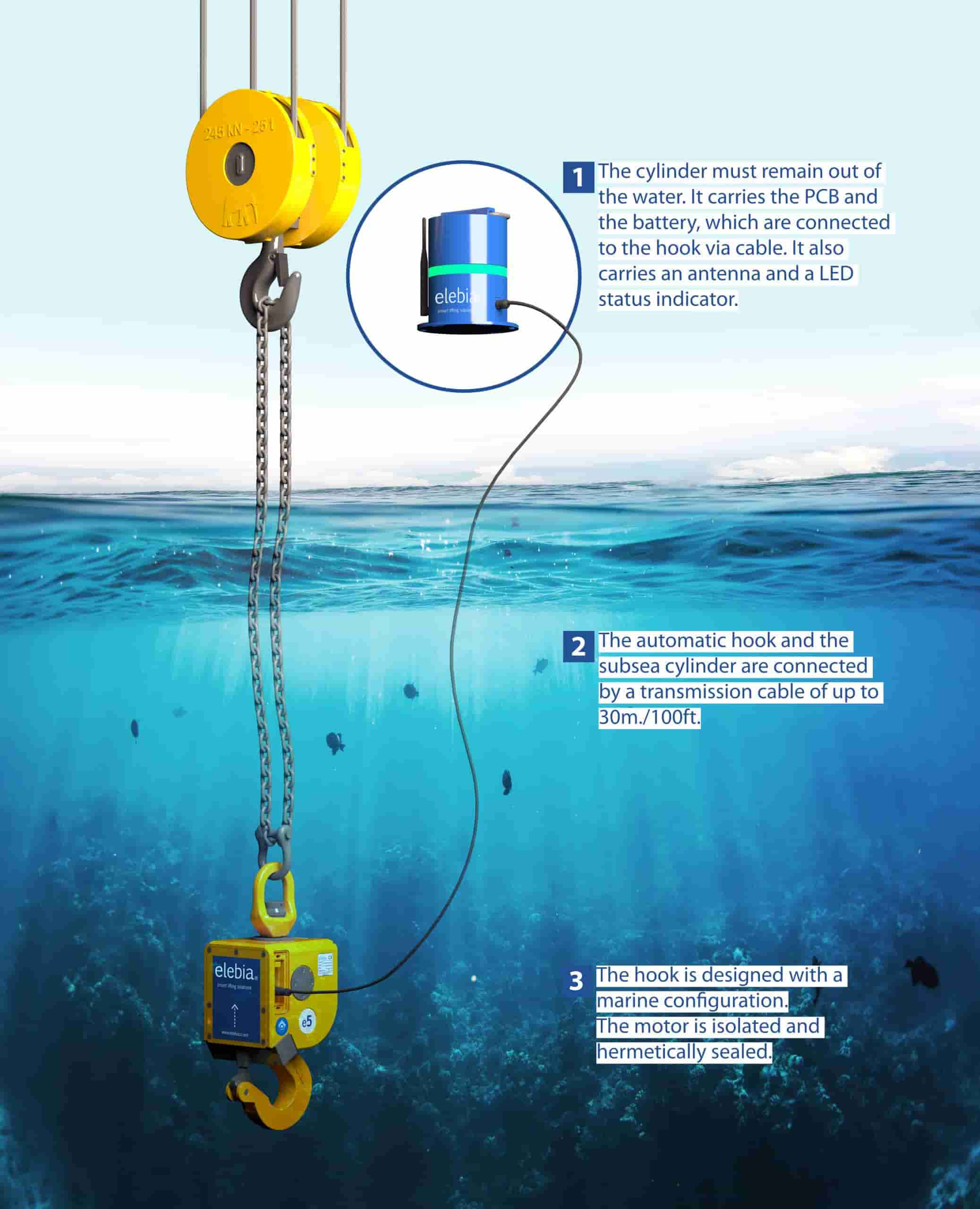 Elebia's subsea hook, currently a prototype, is designed to work effectively underwater, providing a reliable and secure connection in challenging subsea conditions. Its robust design reduces the risk of disconnection.